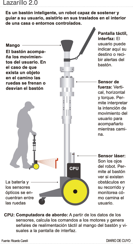 Un equipo interdisciplinario de investigadores de la Universidad Nacional de San Juan (UNSJ) y del Conicet comenzó con este proyecto de crear un bastón robotizado, que puede cumplir un rol tanto de asistencia como de rehabilitación, que dio sus primeros pasos en el Instituto de Automática de la Facultad de Ingeniería.