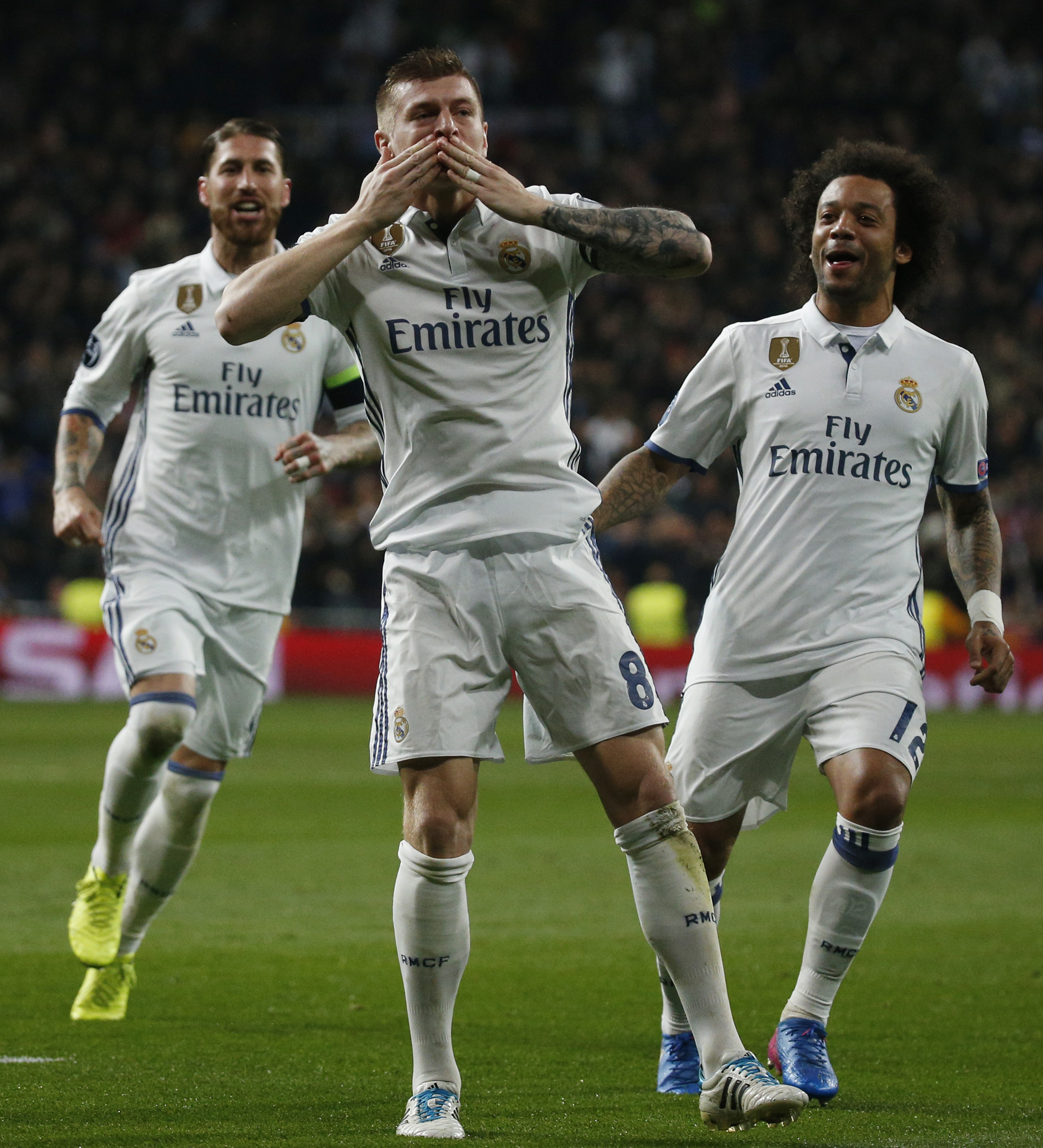 Besos de gol. Toni Kross saluda a la hinchada merengue, tirándole besos luego de convertir el segundo gol del Real Madrid ante el Nápoli. Se le acercan Sergio Ramos y el brasileño Marcelo. La revancha será en Italia.