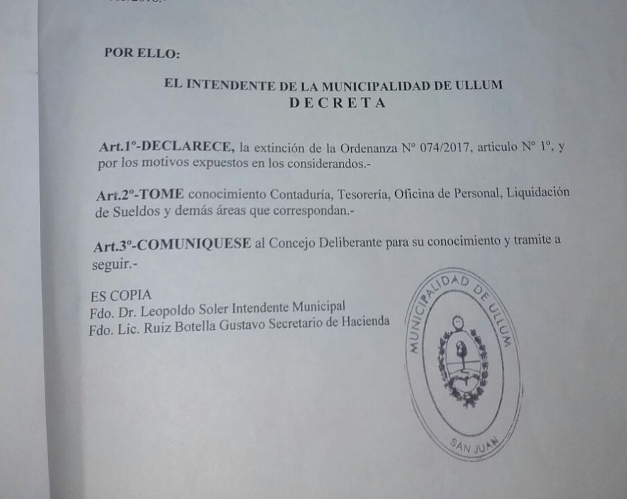 El primer documento que firmó Leopoldo Soler una vez que llegó al municipio de Ullum, el viernes pasado, fue un decreto para dejar sin efecto la ordenanza municipal aprobada el 16 de febrero, día que el intendente termina internado por problemas de salud. Ahora el conflicto surge para saber si ese documento es válido ya que, según se puede leer, declara la “extinción” de una ordenanza, algo que no está permitido y que en su caso debería ser a través de otra ordenanza.