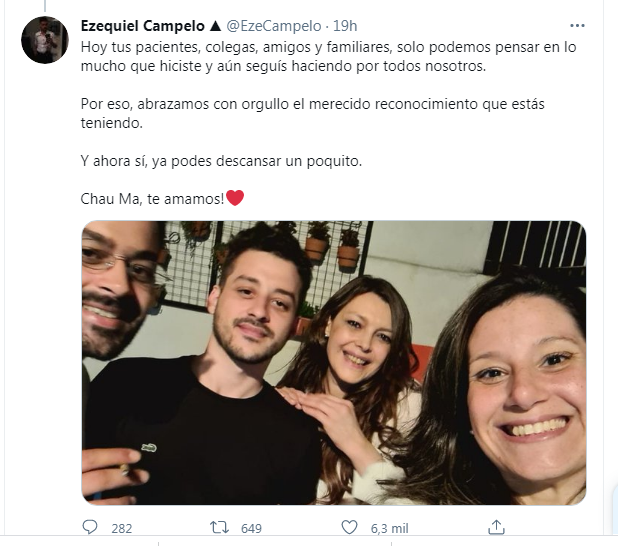 Tras el fallecimiento, el hijo de la médica, Ezequiel Campelo, le dedicó una serie de mensajes en Twitter en los que pidió: “Que tu amor y vocación sirva de ejemplo para todos”.