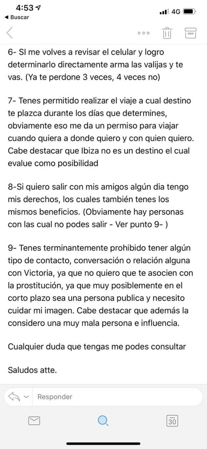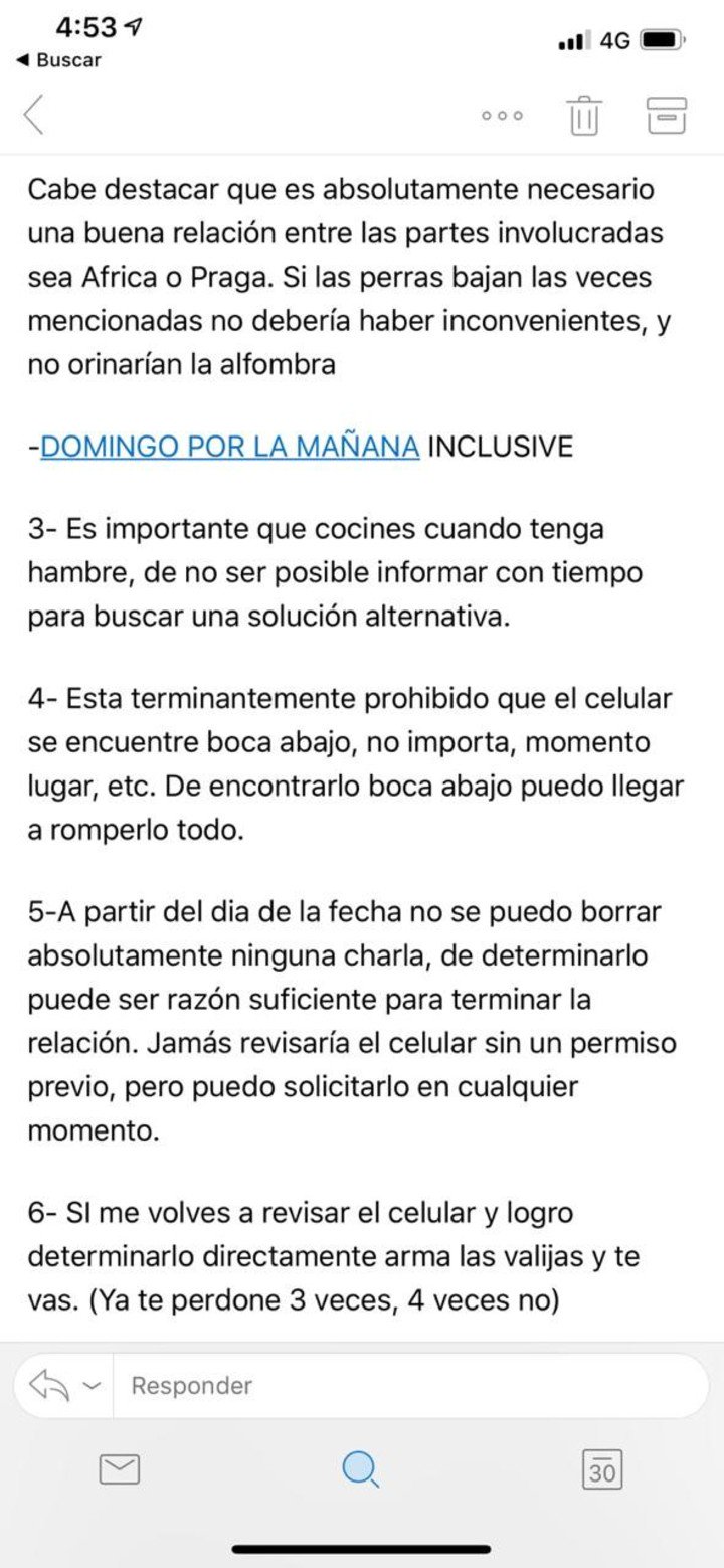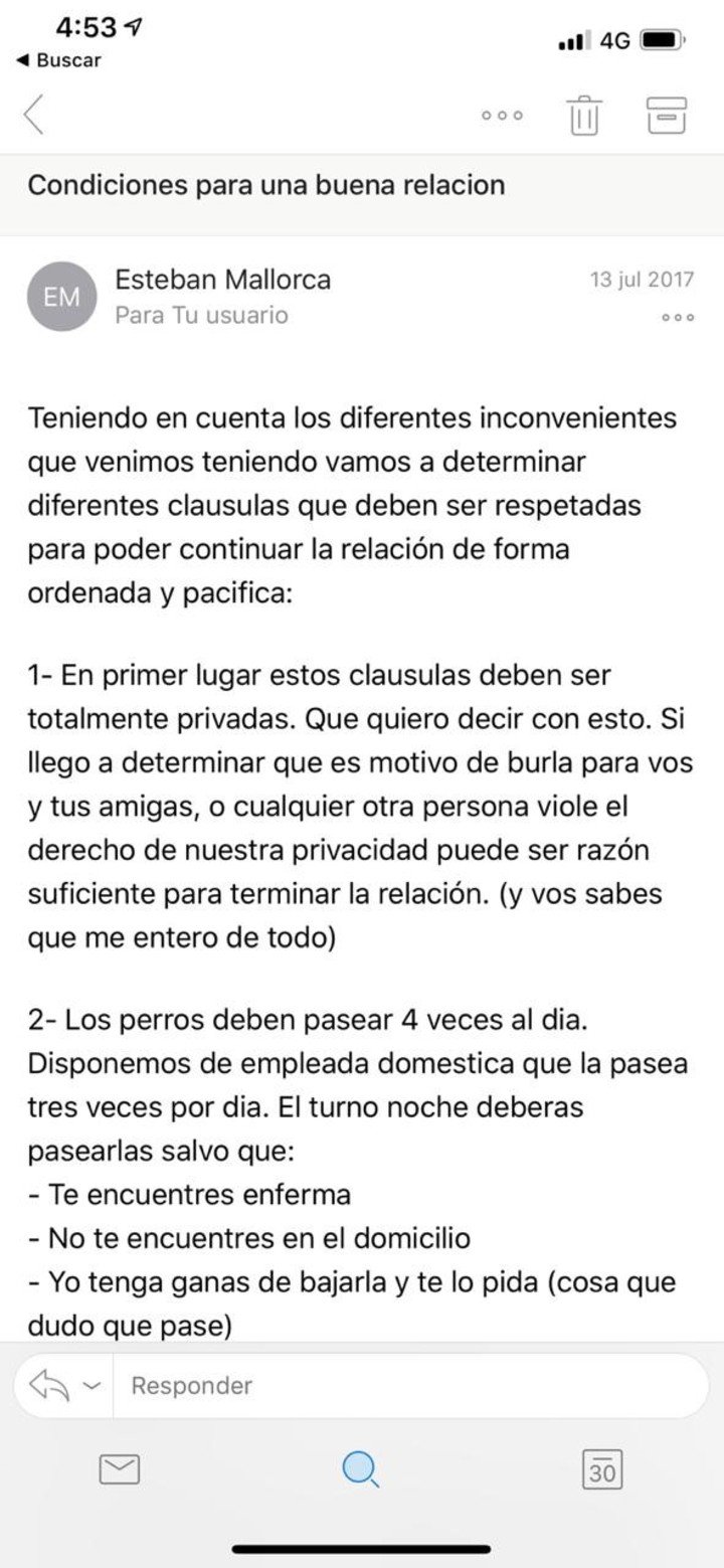 "Teniendo en cuenta los diferentes inconvenientes que venimos teniendo vamos a determinar diferentes cláusulas que deben ser respetadas", encabeza el escrito, detallando en el primer punto que las mismas deben ser totalmente privadas. "Que quiero decir con esto. Si llego a determinar que es motivo de burla para vos y tus amigas, o cualquier otra persona viole el derecho de nuestra privacidad puede ser razón suficiente para terminar la relación. (y vos sabes que me entero de todo)", advierte Mallorca.