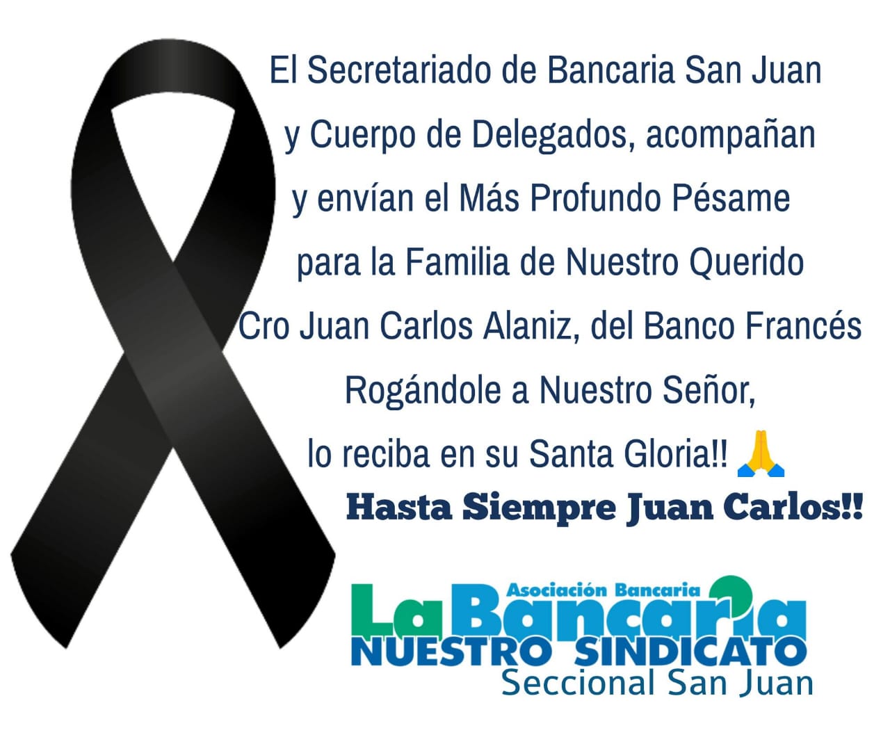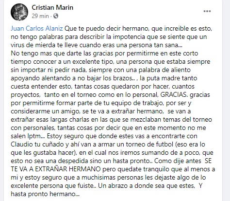 Juan Carlos Alaniz tenía 50 años y se ganaba la vida como empleado en el Banco Francés. Hace unas semanas se contagió de coronavirus y su estado se fue agravando. Tanto que tuvo que ser hospitalizado y en las últimas horas, pese a la intensa lucha, falleció