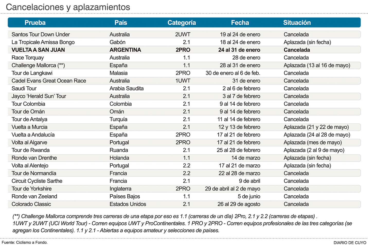Contra la pandemia, no hay ganas, voluntad, ni protocolos que resistan. El Covid-19 con la aparición de sus nuevas cepas es quien impone condiciones. Países que cierran sus aeropuertos. Naciones que tratan de mantener sus competencias emblemáticas, como en estos momentos Australia con su Abierto de Tenis, que ha recibido múltiples críticas por el trato que se ha dado a algunos tenistas obligados a cumplir con estricto período de aislamiento en habitaciones de hoteles por haber tenido la mala fortuna que llegaron al país oceánico en un vuelo donde un par de compañeros de viaje estaban contagiados. En todos lados los funcionarios públicos, como ocurrió en su momento en San Juan, intentan sostener con alfileres la esperanza de organizar su espectáculo. Y, también, en todos lados, la lucha es desigual. Terminan pesando más la responsabilidad y el temor a que se genere un contagio masivo que las ganas de ponerla en escena. Razón por la cual ayer un informe del sitio de Internet "Ciclismo a Fondo" se detallan una por una las 23 carreras que no pudieron con el coronavirus.