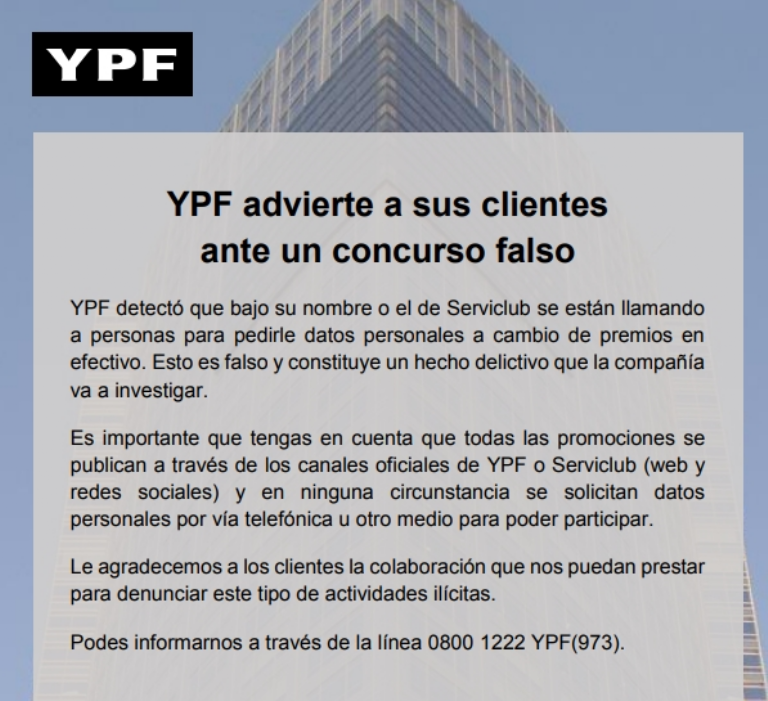 "YPF detectó que bajo su nombre o el de Serviclub se están llamando a personas para pedirle datos personales a cambio de premios en efectivo. Esto es falso y constituye un hecho delictivo que la compañía va a investigar", indica el comunicado que difundió la compañía.