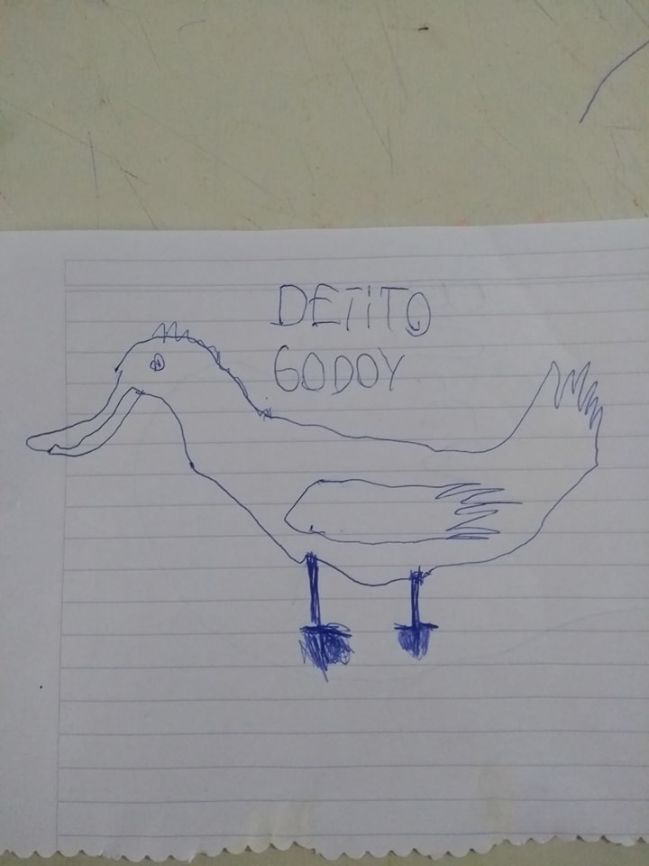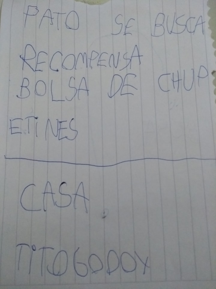 “Pato se busca. Recompensa bolsa de chupetines. Casa Tito Godoy”, escribió junto a la imagen de la mascota, que comparte con sus hermanos, Lucas (4) y Franco (1), que él mismo dibujó.