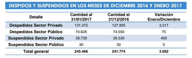 En total, desde diciembre de 2015 y hasta el 31 de enero de 2017 se contabilizan 245.466 despidos y suspensiones. Los despedidos ascienden a 205.697 y los suspendidos a 39.769 casos. Dentro de ellos, los despidos del sector privado ascienden a 131.072 y las suspensiones suman 39.739.