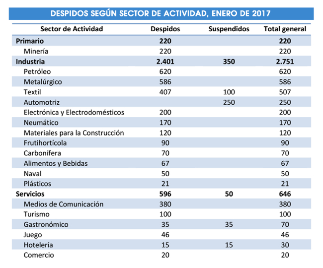 Encabezan el ranking de despidos y suspensiones acumulados desde diciembre de 2015 la rama metalúrgica, con 17.567 despedidos y suspensiones; el sector textil, con 3.752 despidos y 11.820 suspensiones; el sector automotriz con 9.410 bajas laborales (al que deben complementarse 1.514 trabajadores despedidos y suspendidos en y 364 despidos y 1.800 suspensiones en el sector neumático); el sector petrolero con 8.117 casos; electrónica y electrodomésticos, con 5.123 despidos y 2.870 suspensiones de trabajadores y el sector alimenticio con 7.469 despidos y suspensiones. Estas actividades suman el 77% de los despidos y suspensiones entre diciembre 2015 y enero 2016.
