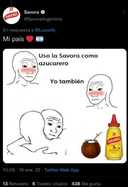 En las redes sociales, se pueden encontrar una gran cantidad de virales sobre conversaciones en diferentes apps como WhatsApp, Instagram, Snapchat, entre otras. En esta ocasión, una joven comentó en Twitter que su pareja tomaba el mate con mostaza, pero el CM de "Savora" al ver el tuit compartió un meme para explicar qué era lo que sucedía en verdad y luego la cuenta de otra marca evidenció toda su desilusión al conocer el verdadero secreto.