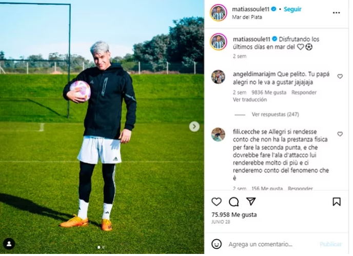 Hace dos semanas, el juvenil se mostró en sus redes sociales con un nuevo look mientras estaba de vacaciones en Argentina: “Disfrutando los últimos días en Mardel”, escribió. En la foto que publicó se lo ve con un color platinado en su pelo y uno de los primeros en comentar fue su ex compañero. “Que pelito. Tu papá Allegri no le va a gustar jajajaja”, escribió Di María.