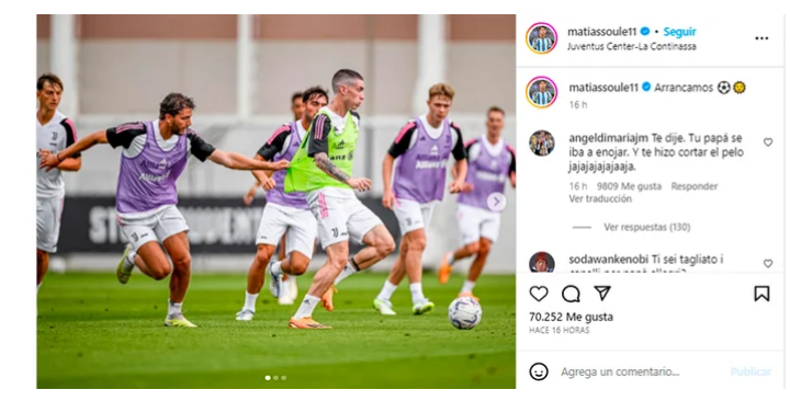 En las últimas horas, ya de regreso en Italia para iniciar los trabajos de pretemporada de cara a lo que será la competencia de la 2023-2024, Soulé subió varias imágenes de lo que fueron los primeros entrenamientos con la Juventus. Para sorpresa de varios, en las fotos se lo puede ver al zurdo con un nuevo look en su cabello. Dejó el color platinado y se cortó muy corto. Tal cual como había sucedido hace algún tiempo atrás, el que rápidamente notó dicho cambio fue Di María.