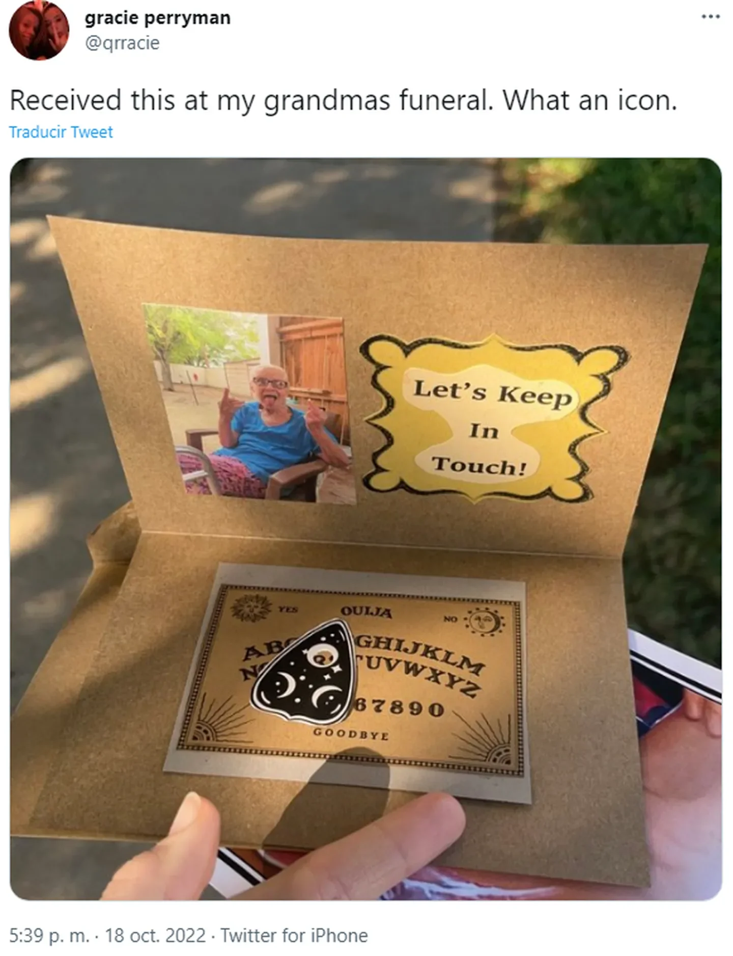 En las últimas horas, Jodie Perryman, una abuela que falleció de cáncer a los 81 años, se volvió viral por asegurarse que sus familiares se mantengan en contacto con ella desde el más allá. Una de sus nietos mostró una tarjeta con una ouija en miniatura que su abuela le regaló el día de su funeral.