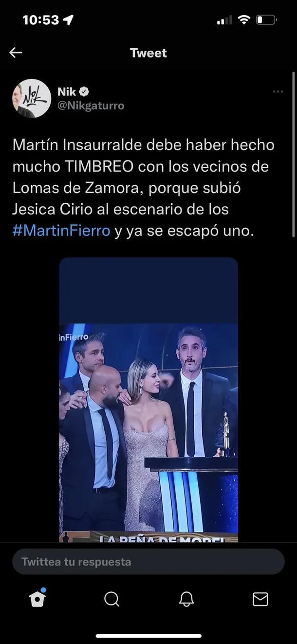 "Martín Insaurralde debe haber hecho mucho TIMBREO con los vecinos de Lomas de Zamora, porque subió Jésica Ciro al escenario de los Martín Fierro y se le escapó uno", escribió Nik junto a la foto del incómodo momento.
