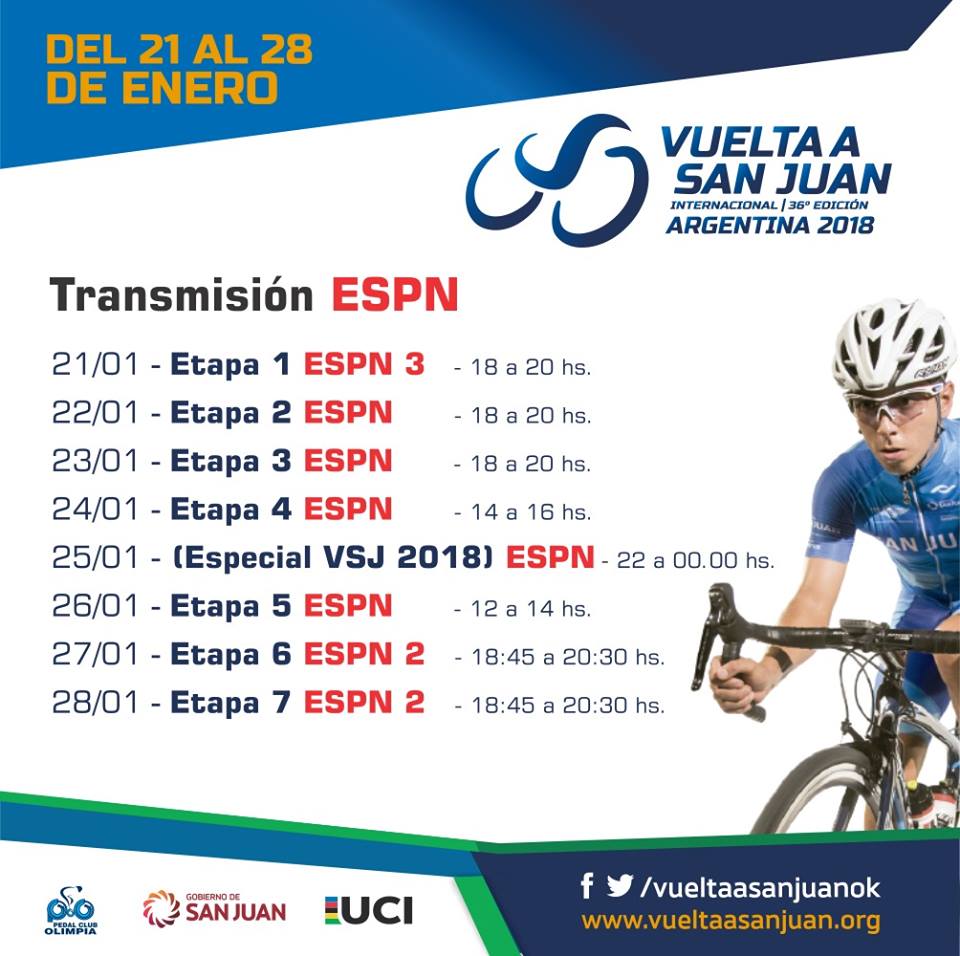 La edición número 36 de la Vuelta a San Juan, que por segundo año consecutivo es internacional, será televisada. El canal deportivo ESPN transmitirá el evento que comienza este domingo 21 y termina el próximo 28 de enero.