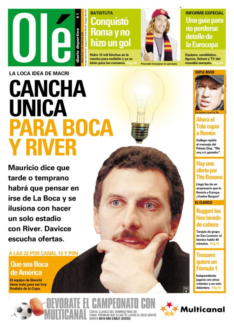 "Irse del barrio es complicado, conseguir un terreno que tenga un acceso como la gente, también. Pero en algún momento habrá que encararlo. Voy a decir algo que por ahí parece muy loco: si tuviésemos que encarar un estadio nuevo, deberíamos hacerlo con River", le había manifestado Macri al diario Olé, en una entrevitsta que dara del 7 de junio del 2000.