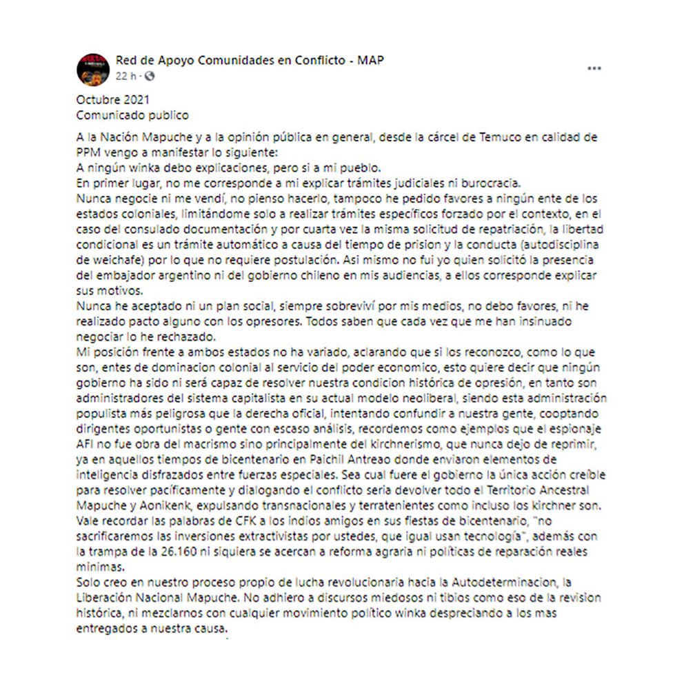 Desde la cárcel de Temuco, Jones Huala habló sobre su situación en el vecino país: "No me corresponde a mí explicar trámites judiciales ni burocracia. Nunca negocié ni me vendí, no pienso hacerlo, tampoco he pedido favores a ningún ente de los estados coloniales, limitándome solo a realizar trámites específicos forzado por el contexto, en el caso del consulado, documentación y, por cuarta vez la misma solicitud de repatriación, la libertad condicional es un trámite automático a causa del tiempo de prisión y la conducta (autodisciplina de weichafe) por lo que no requiere postulación”, arranca el comunicado.