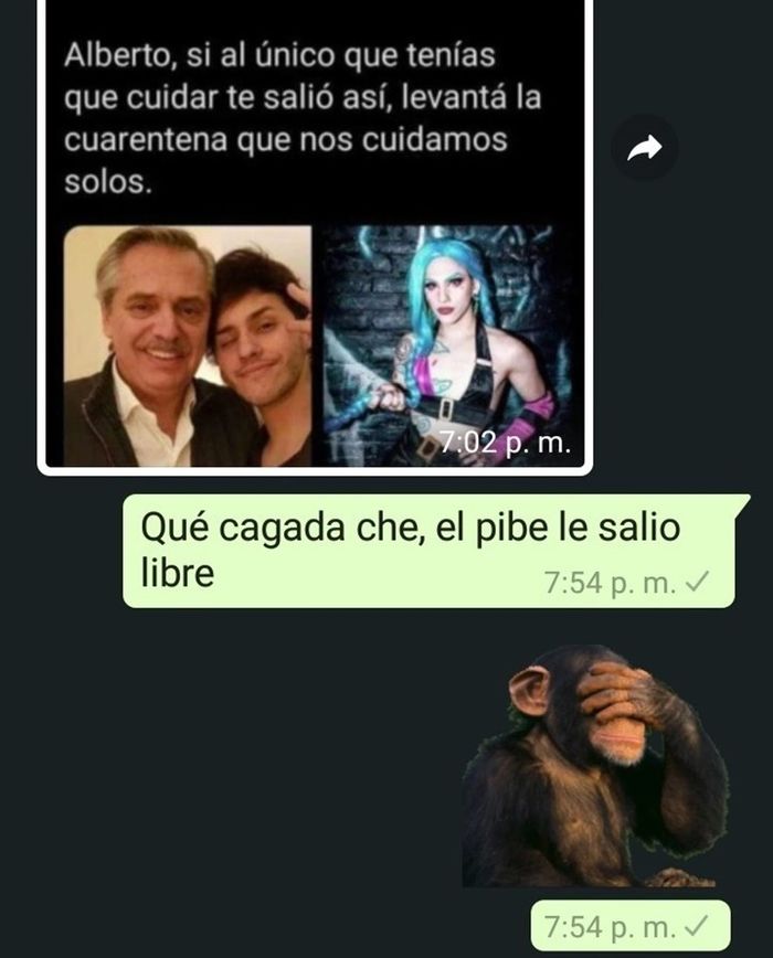 En este sentido, el hijo del presidente Alberto Fernández continuó respondiendo a quienes consideran que "salió dañado" o que es "el fruto de una paternidad fallada". "Andá a resolver los problemas que vos tenés con tu viejo, papi. Tenés un problema mental. No me importa qué haya sido, si fue grave o no, pero yo tuve una infancia muy plena y feliz. Lo único que hice en mi vida para que me cuestionen en la vida es ser pu…, y no tengo nada más. Porque solo me cuestionan por eso y por mi viejo, no tienen nada más. Carecen de argumentos. El conservador me chupa el cu…, me importa un carajo y le mandamos un beso", remarcó.