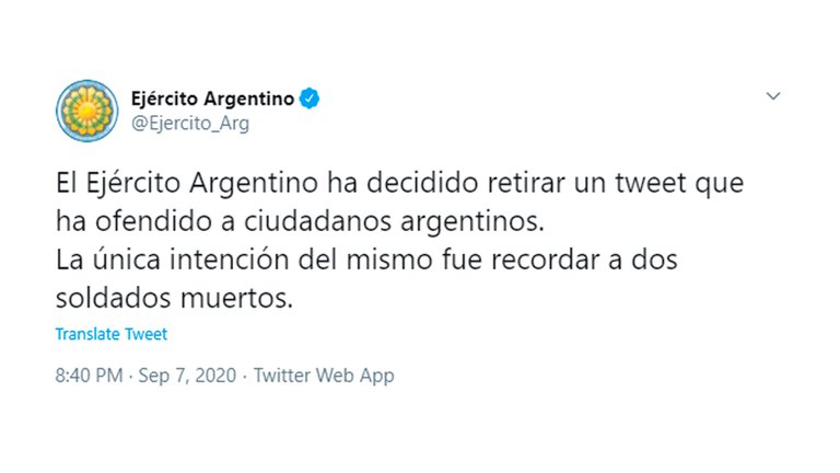 Anoche, el Ejército decidió "retirarlos" con este mensaje: "El Ejército Argentino ha decidido retirar un tweet que ha ofendido a ciudadanos argentinos. La única intención del mismo fue recordar a dos soldados muertos".