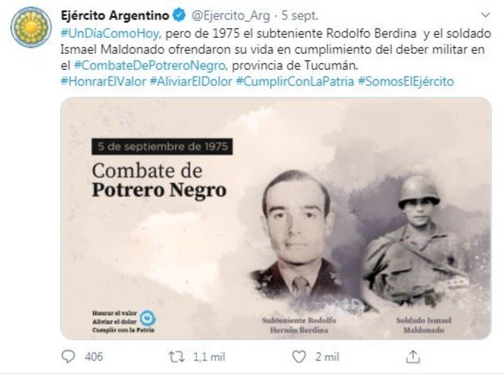El 5 de setiembre, el Ejército que conduce el general Agustín Humberto Cejas, recordó que “un día como hoy, pero de 1975 el subteniente Rodolfo Berdina y el soldado Ismael Maldonado ofrendaron su vida en cumplimiento del deber militar en el Combate de Potrero Negro, provincia de Tucumán”. Y sigue con hashtags varios: “Honrar el valor, Aliviar el dolor, Cumplir con la Patria, Somos el Ejército”.