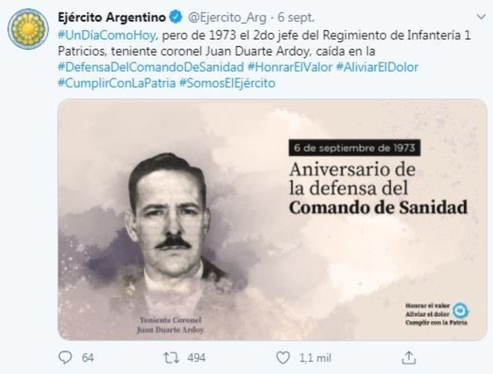 El otro tuit de “efemérides” fue al día siguiente, este domingo 6: “Un día como hoy, pero de 1973 el 2do jefe del Regimiento de Infantería 1 Patricios, teniente coronel Juan Duarte Ardoy, caía en la defensa del Comando de Sanidad”.