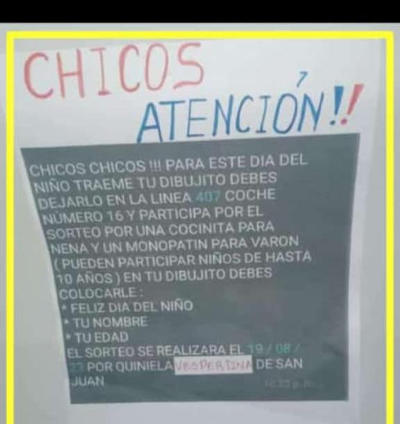 "Un dibujo por un número", podría denominarse su iniciativa. El lunes colgó un cartel en su colectivo donde explicaba que, por celebrarse el día del niño, iba a realizar un sorteo a través de la quiniela y los premios serían juguetes: una cocinita para las nenas y un monopatín para varón. La campaña realizada por el chofer llamó la atención de los usuarios que diariamente viajan con Rivarola, es por eso que varias personas decidieron colaborar con otros juguetes de manera que hubieran más ganadores.