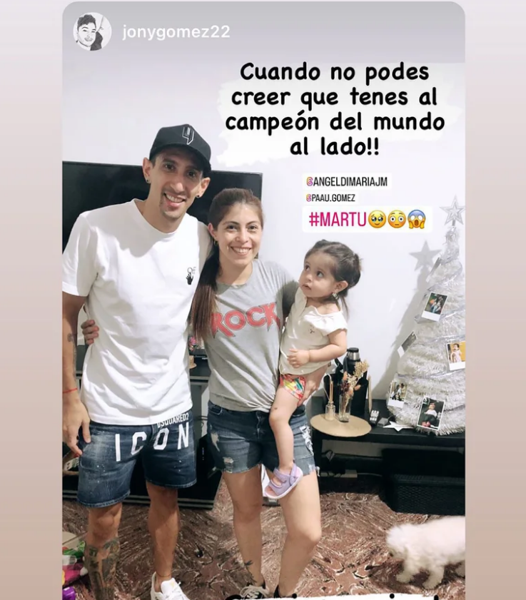 El dueño del hogar donde se organizó la comida le escribió un sentido mensaje al extremo. “Es increíble la felicidad, alegría y orgullo que siento hoy. Gracias Ángel. ¡Gracias amigo! Fue un placer recibirte en casa y que vengas a festejar que somos campeones del mundo con tus amigos. Los que van a estar siempre. ¡En las buenas y en las malas! Qué regalito que nos trajo Papá Noel”, arrancó Jonatan Gómez. Y concluyó con un mensaje motivacional: “Siempre con la cabeza bien arriba. Está permitido caerse mil veces, pero es obligatorio levantarse 1001 vez y más. Y ese es el ejemplo que le mostraste al mundo”.