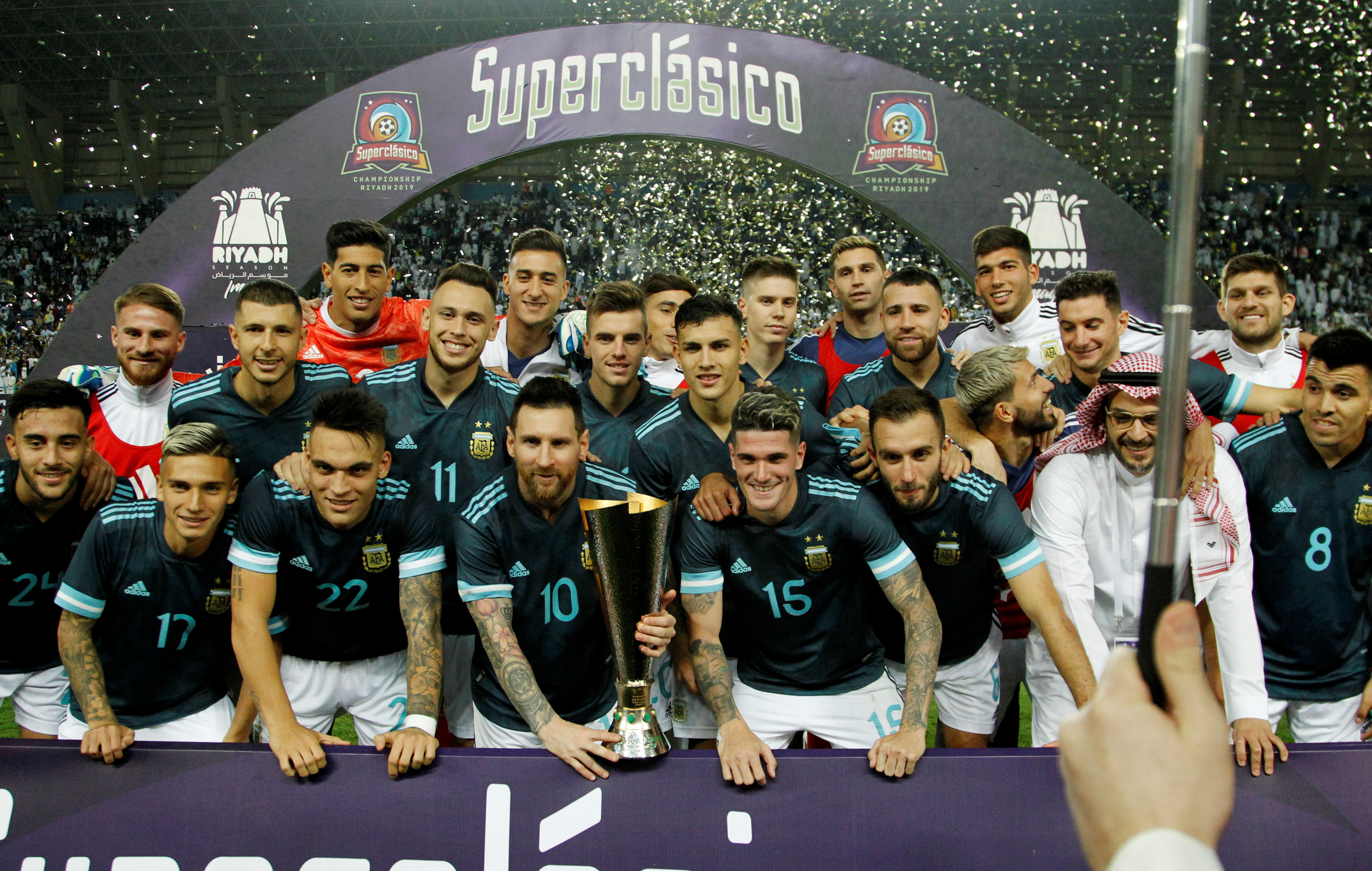 De festejo. El plantel argentino celebra con el trofeo. El técnico Scaloni dijo que "es importante el sabor que se llevan los chicos".