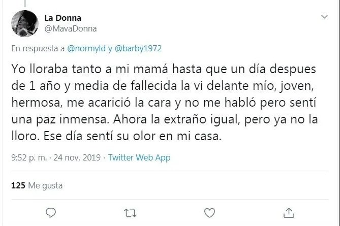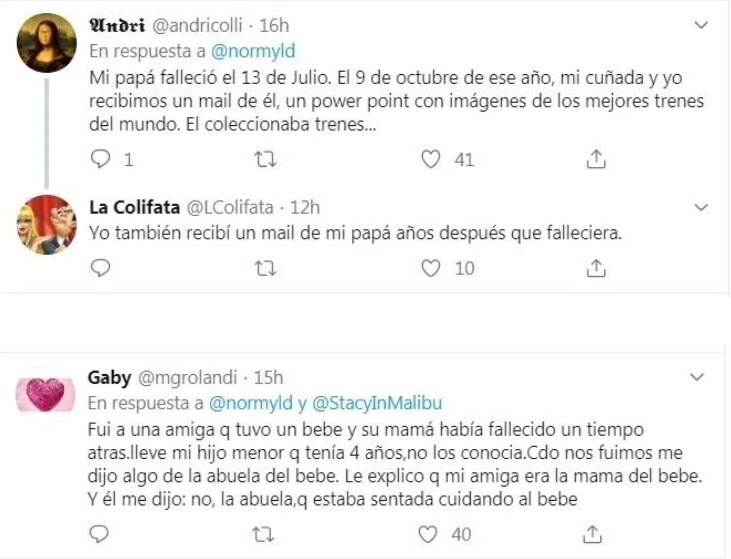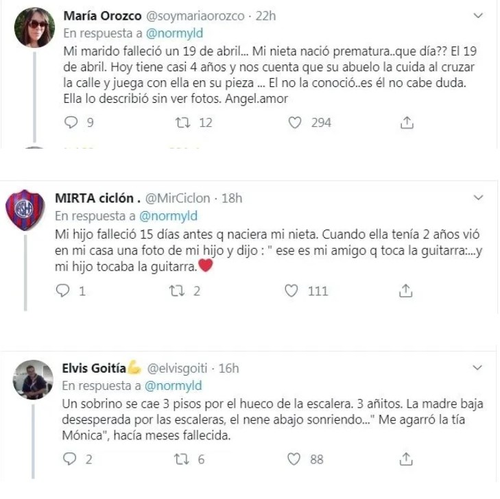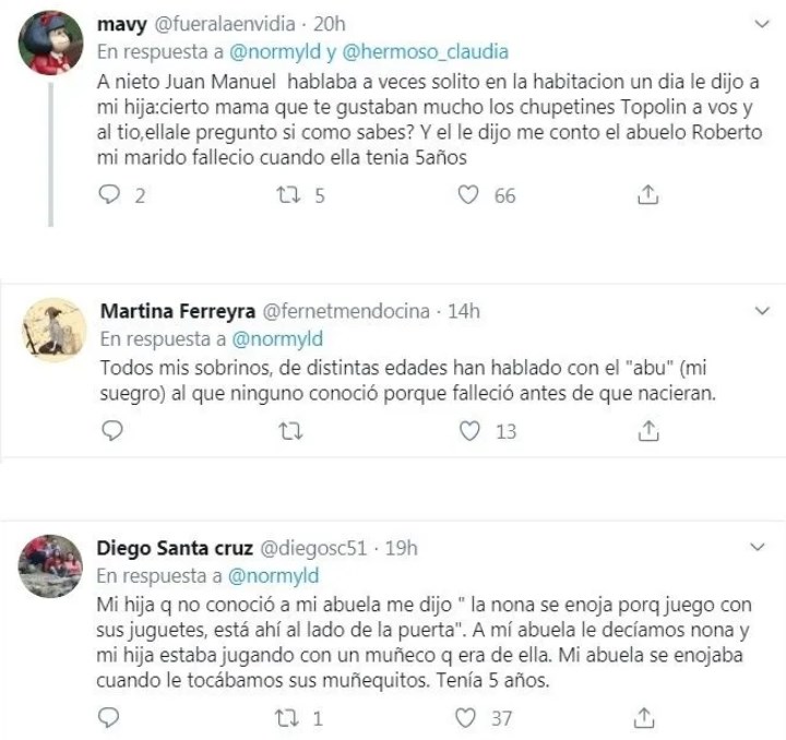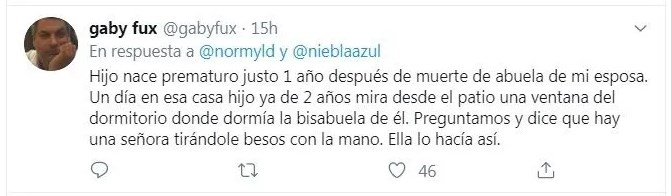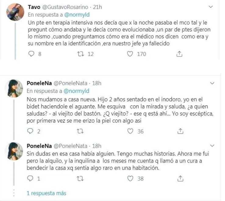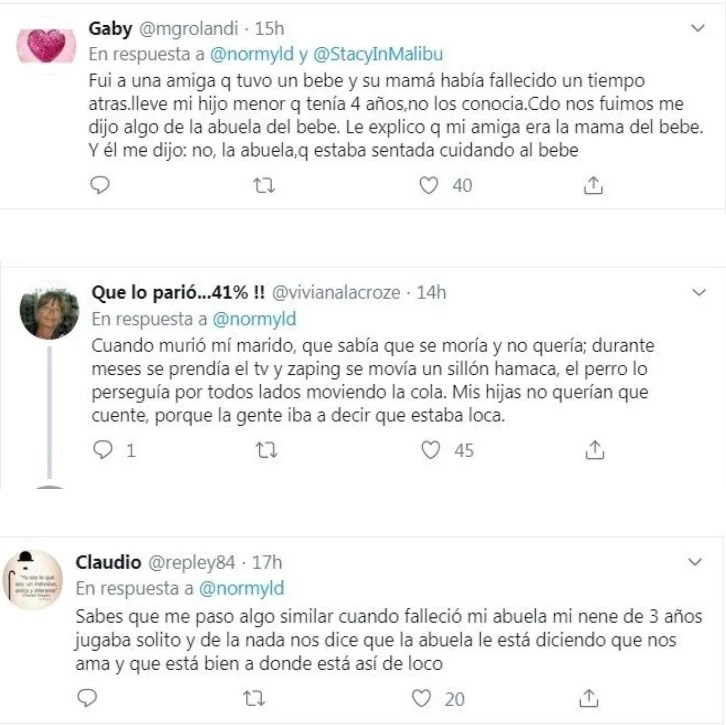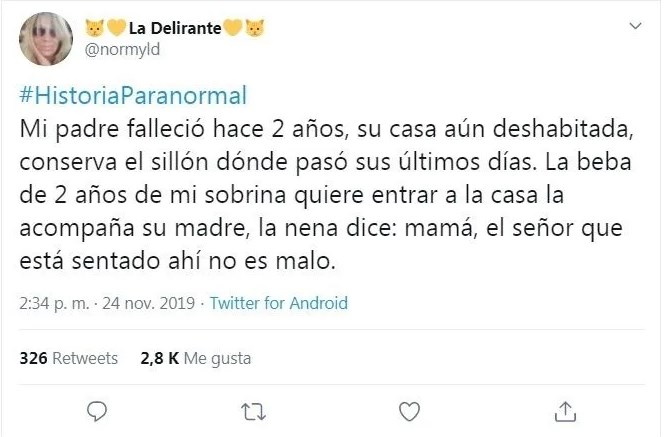 "Mi padre falleció hace 2 años, su casa aún deshabitada, conserva el sillón dónde pasó sus últimos días. La beba de 2 años de mi sobrina quiere entrar a la casa la acompaña su madre, la nena dice: mamá, el señor que está sentado ahí no es malo" reveló el escalofriante tuit de @normyld y acto seguido miles y miles de comentarios reflejaron escalofriantes casos.