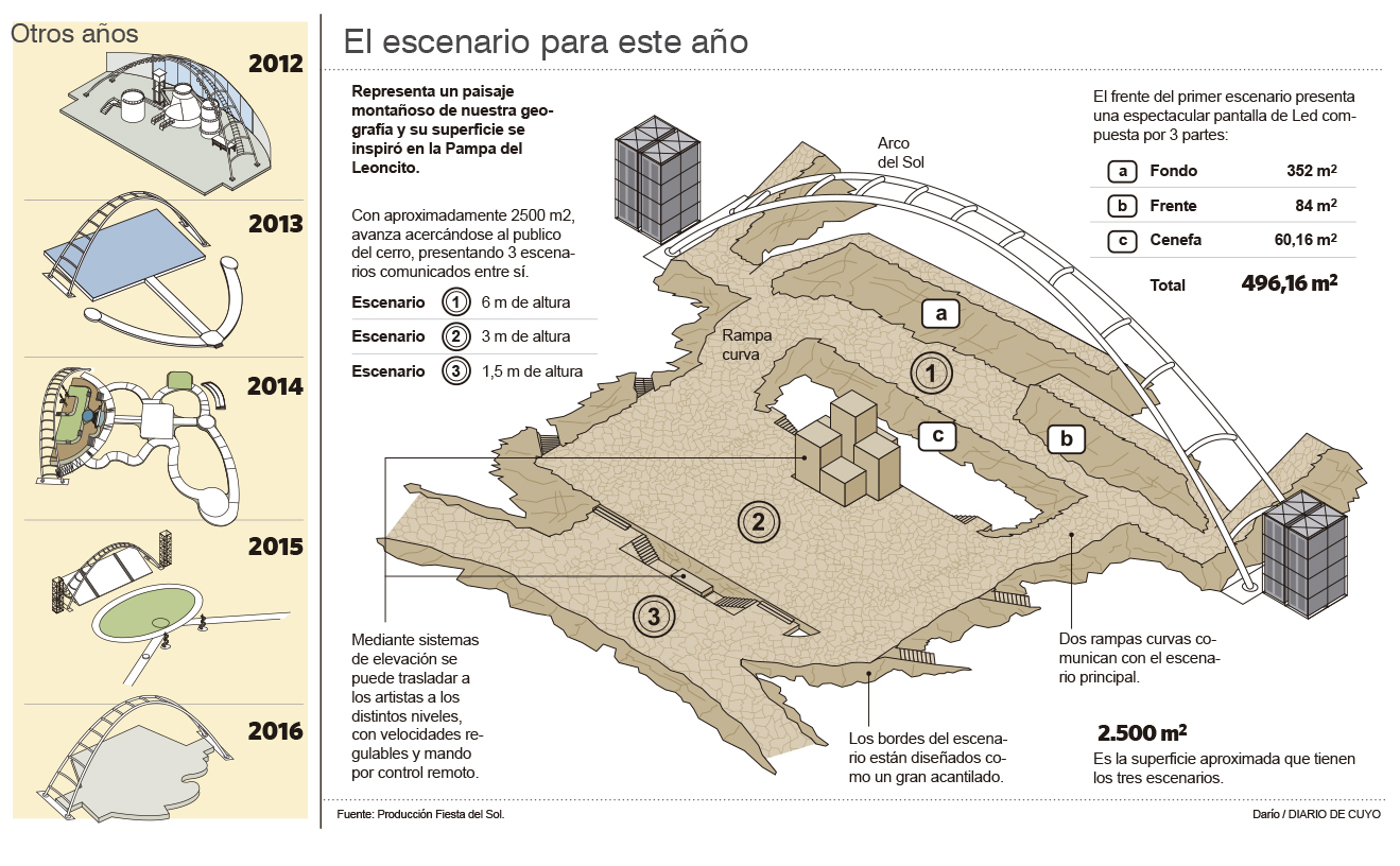 Al igual que todos los años, el autódromo El Zonda-Eduardo Copello comenzó a transformarse para recibir a miles de personas durante el cierre de la Fiesta Nacional del Sol. Es por esto, que camiones, máquinas y ciento de personas trabajan todos los días para preparar el escenario que este año será más grande que otras ediciones y estará más cerca de la gente que se ubique en el cerro, gratis. El lugar donde actuarán unos 400 artistas representa un paisaje montañoso. Según la ministra de Turismo, Claudia Grynszpan este escenario está inspirado en la Pampa del Leoncito, de Calingasta. El escenario será estrenado el sábado 25 de febrero cuando se realice el espectáculo Cruce de los Andes.