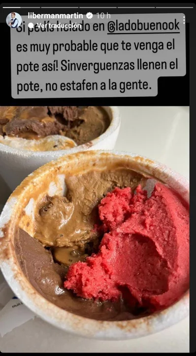 Hace unos días, Liberman y su esposa Anita Laura López pidieron de nuevo a Lado bueno. Aparentemente recibieron el pote medio vacío y derretido y, según aclaró en una storie el periodista, hicieron el debido reclamo a través de la app. Recién este lunes le contestaron con algunas vueltas, por lo que Liberman decidió subir una storie escrachando a la heladería.