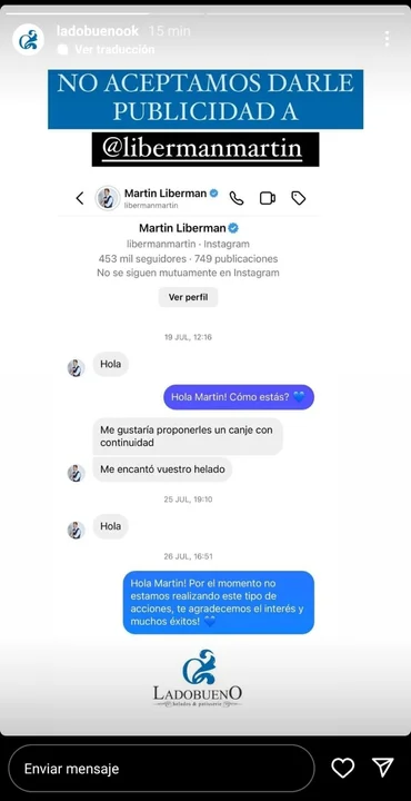 Por un kilo de helado, el periodista Martín Liberman quedó escrachado. Luego de proponerle por mensaje privado en Instagram hacer un canje a una heladería, recibió una respuesta negativa con respeto, lo que lo enfureció y decidió escrachar al comercio con una mentira. Lejos de inhibirse, la heladería redobló la apuesta, y expuso todo sin problema en la red social.