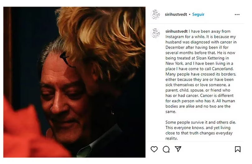 Auster y Hustvedt mantienen desde hace cuarenta años una relación de pareja y, además, de "primeros lectores", como lo describió ella en una entrevista en 2020. En el texto que publicó en su cuenta explica cómo ese vínculo también se reformuló en los días en el hospital: "La intimidad con otra persona no es sólo una experiencia paralela, dos líneas que se mueven en la misma dirección pero que no se cruzan. Es mucho más como un diagrama de Venn dinámico, si tal cosa es posible, las partes superpuestas de dos círculos siguen moviéndose y cambiando con el tiempo. Un "Yo" y "tú" en movimiento que también es ‘nosotros’".