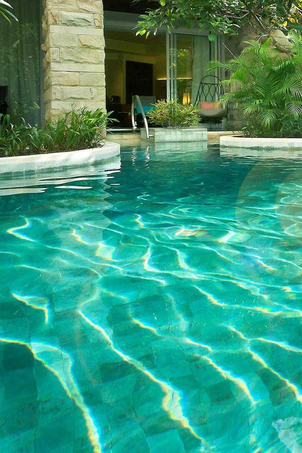 La piedra Bali hace que la pileta tenga un atractivo de belleza natural. Ideal para crear espacios de ensueño, o ambientes con estilo delicadamente agreste. El agua parece más transparente luego de su aplicación. Gracias a su veta natural y sus patrones sutilmente irregulares, no se repite una pieza con otra. Estas variantes hacen que varíe la intensidad de color del agua y su tonalidad, según la profundidad del vaso y como se refleje la luz del día. Predomina el color verde esmeralda, y con un diseño adecuado, les otorgan a los espacios acuáticos una singularidad estética de aspecto exótico y tropical.