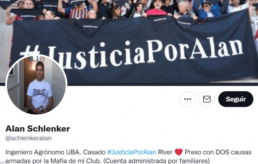 En su cuenta de Twitter, Schlenker remarca que está “preso con DOS causas armadas por la Mafia de mi club”.