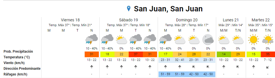 Según el Servicio Meteorológico Nacional (SMN), el sábado será una continuidad de estos días en San Juan. La temperatura ascenderá hasta los 37 grados y, especialmente por la noche, habrá probabilidad de lluvia -baja, inferior al 40%-, que continuará en la madrugada siguiente.
