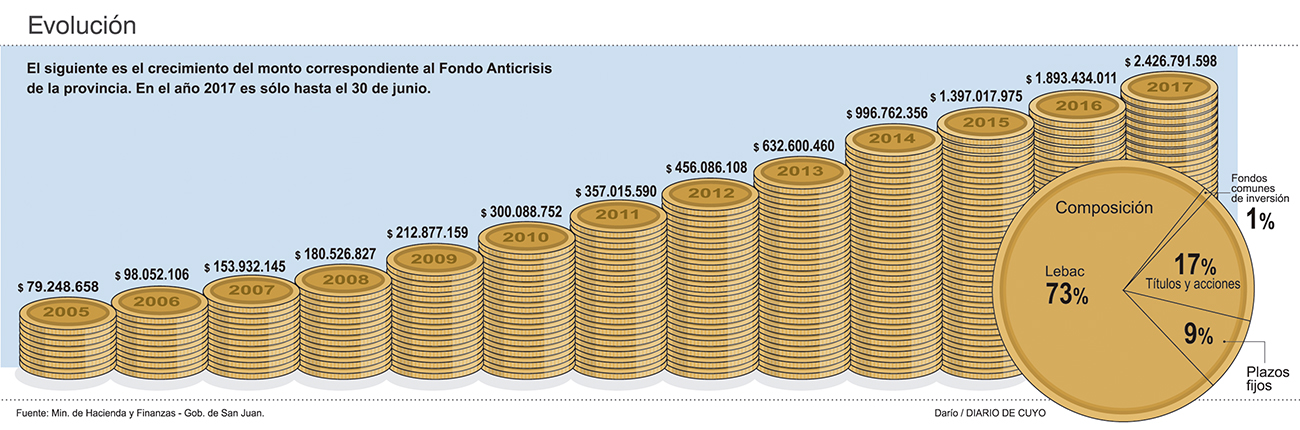 El llamado fondo anticrisis, una reserva oficial creada por el Gobierno provincial para afrontar tiempos difíciles, creció en el primer semestre de este año un 28%, al pasar de los 1.893.434.011 pesos que estaban guardados hasta diciembre del año pasado, a 2.426.791.598 pesos que hay ahora, según las cifras disponibles hasta el 30 de junio pasado. Se trata de un auxilio que equivale, al menos, a 2 grillas salariales de la administración pública, pero que en la actualidad supera a esa referencia con creces. Es porque la suma de 2 meses de los sueldos de los estatales equivalen a 1.757.343.731 pesos. Y los 669.447.867 pesos de diferencia están un 38% por arriba del dinero necesario para afrontar los haberes de los empleados del Estado.