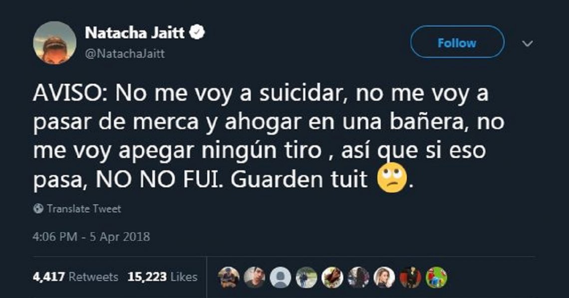 En aquel entonces, fiel a su estilo verborrágico y trasgresor, la modelo había lanzado una seria advertencia a través de su cuenta de Twitter, una de las plataformas que más utilizaba para estar en contacto con sus fans. Aquel día, escribió: "No me voy a suicidar, no me voy a pasar de merca y ahogar en una bañera, no me voy a pegar un tiro. Si eso pasa, yo no fui".