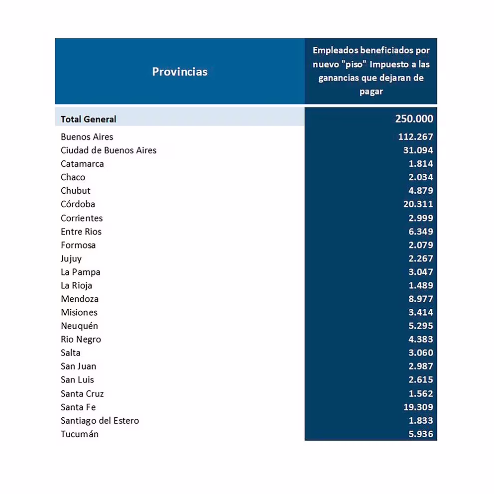 La modificación propuesta permitirá que aproximadamente 250.000 trabajadores en relación de dependencia dejen de pagar el tributo, según cálculos realizados por el Palacio de Hacienda. Poco más de 112.000 de esos trabajadores están localizados en la provincia de Buenos Aires, otros 31.000 en la Ciudad Autónoma de Buenos Aires y cerca de 40.000 están distribuidos entre las provincias de Córdoba y Santa Fe. Las estimaciones exactas del número de beneficiarios por provincia puede verse en el cuadro adjunto.