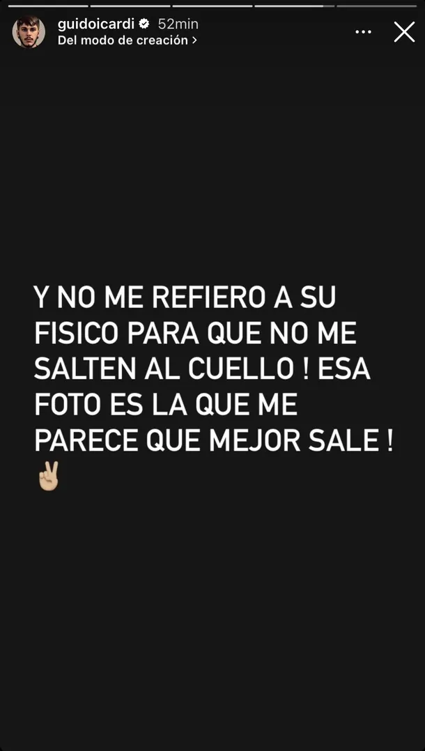 En sus historias de Instagra, Guido compartió una foto de la modelo, en la que luce sin filtros ni retoques como la mayoría de las imágenes que ella postea en sus redes. Y no solo que eligió una polémica imagen sino la que acompañó con un mensaje que tuvo doble interpretación.