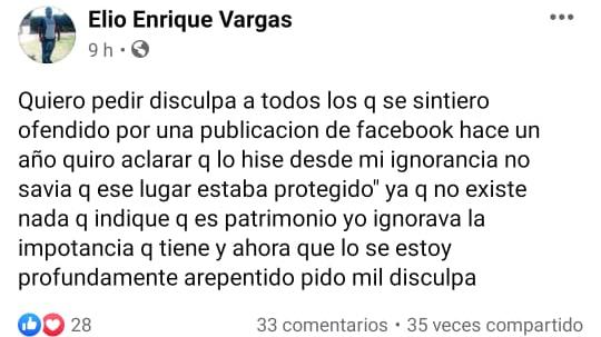 “Quiero pedir disculpas a todos los que se sintieron ofendidos por una publicación de Facebook de hace un año. Quiero aclarar que lo hice desde mi ignorancia no sabía q ese lugar estaba protegido", aseguró Elio Enrique Vargas en su cuenta de Facebook.