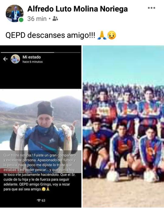 Ante la triste noticia, el mundo del fútbol sanjuanino manifestó su dolor. Uno de los referentes que expresó sus condolencias en las redes sociales fue Alfredo "Luto" Molina, quien escribió en su cuenta de Facebook: "Qué triste noticia, fuiste un gran compañero y excelente persona. Apasionado del fútbol y la pesca. Hace poco me dijiste qué triste estabas por no poder pescar y, qué ironía, hoy te tocó irte justamente haciéndolo", escribió.