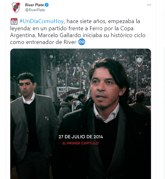 "#UnDíaComoHoy, hace siete años, empezaba la leyenda: en un partido frente a Ferro por la Copa Argentina, Marcelo Gallardo iniciaba su histórico ciclo como entrenador de River", se puede leer en la cuenta de Twitter del club junto a un emojo de infinito al final y con una foto de ese día en Salta donde de fondo también está Matías Biscay, uno de sus ayudantes y compañero en este camino.