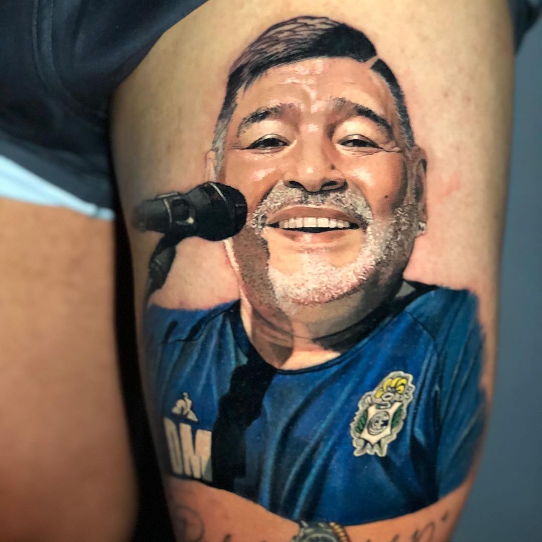 Se trata de Patricio Monti, volante del Lobo, quien se tatuó una foto de una conferencia de prensa de Maradona durante su paso por el Tripero en el muslo izquierdo y el resultado fue el de una imagen híper realista.
