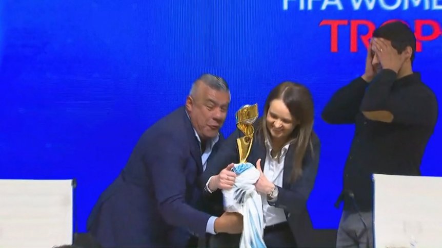 Al finalizar el evento casi se le cae la Copa y además la tocó, derecho exclusivo de los campeones mundiales. Todo esto ante los ojos de Sara Booth, Directora del Departamento de Competiciones Femeninas de FIFA, y Veronica Boquete, leyenda y ex jugadora de la Selección de España, que intentaron subsanar el error del dirigente argentino.