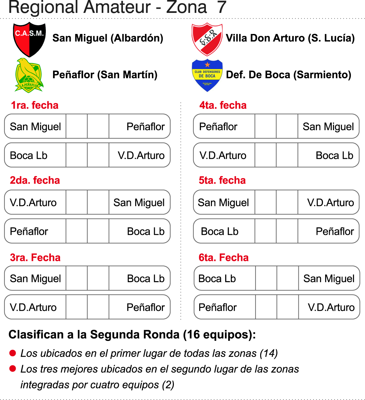 A una semana del debut, los peso pesados del interior sanjuanino piden cancha. El multicampeón albardonero San Miguel, el legendario Atlético Peñaflor de San Martín, el aguerrido Defensores de Boca de Los Berros y el ambicioso Villa Don Arturo prometen una competencia más que feroz en la Zona 7, sabiendo que solamente el primero clasificará tras las seis fechas y que en el caso de ser segundos, tendrán que buscar ser de los mejores entre todas las zonas de la Región Cuyo para meterse en la Segunda Etapa del Regional Amateur. Una zona más que competitiva, con grandes en serio.