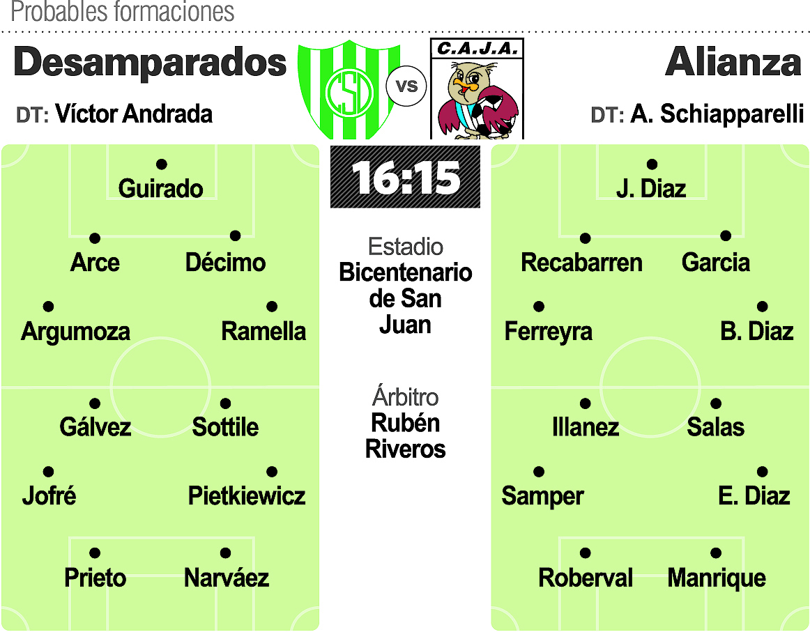 En lo deportivo, Desamparados presentará los ingresos de Argumoza y Sottile en reemplazo de los lesionados Rojas y Fondacaro, mientras que del lado de Alianza se anuncia la presencia del prometedor delantero Nicolás Manrique como gran novedad.