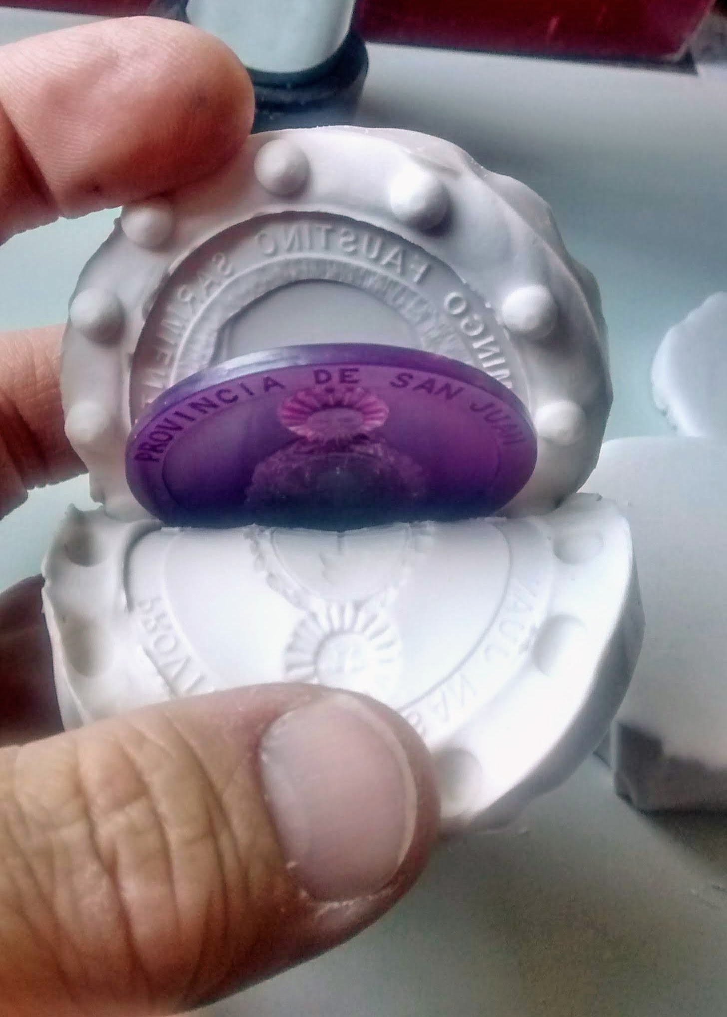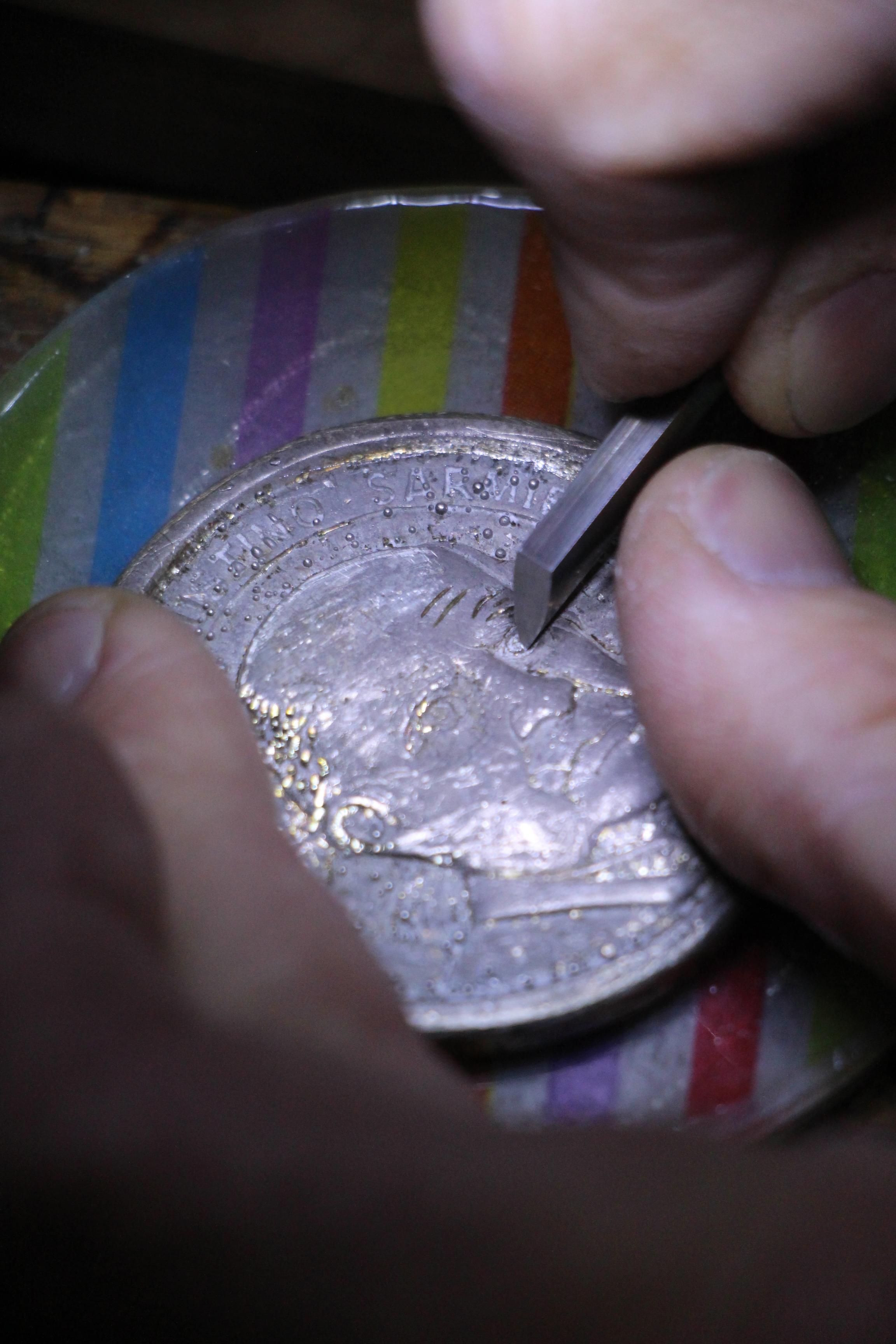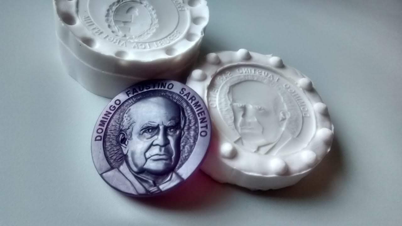 "Tuve que modelar en cera y con un buril el retrato de Sarmiento para darle forma y para eliminar los claroscuros que tenía la pintura pero que no podían aparecer en el relieve de la medalla final. Luego otro molde de caucho de silicona que es flexible y trabaja en frío, para obtener múltiples copias de cera. A las que hay retocar porque se pierden muchos detalles respecto del original. Así es que las figuras de las medallas van pasando por un proceso de moldería con material de revestimiento refractario, que se quema a 700 grados en un horno para que desaparezca totalmente la cerca interior del molde y ese es el momento, cuando el molde está caliente, en que se puede inyectar el material metálico fundido, en la centrífuga. Después se hacen las terminaciones con el burilado", resume a grandes rasgos todo el proceso. Aunque hay una medalla en especial, la que lleva oro, que le implicó incursionar por otros caminos, los del baño electrolítico y el uso de electricidad a bajo voltaje para revestirla en metal dorado.