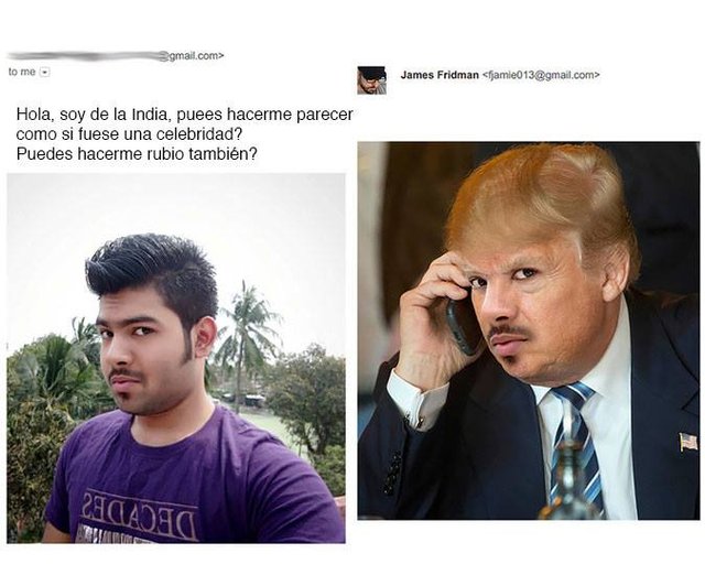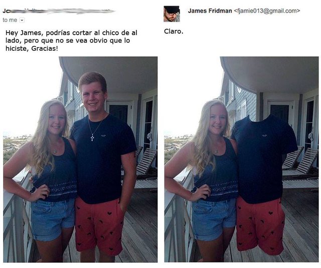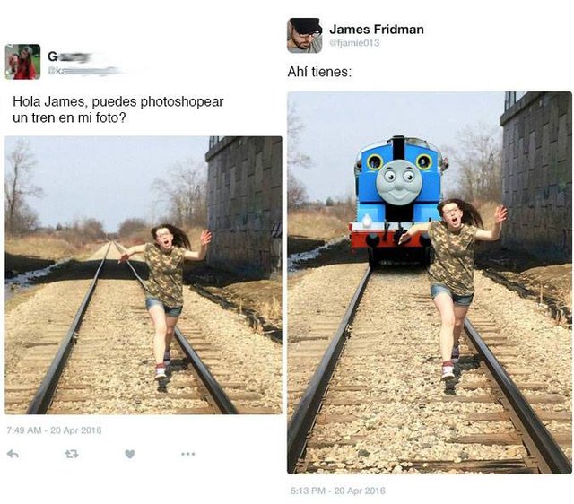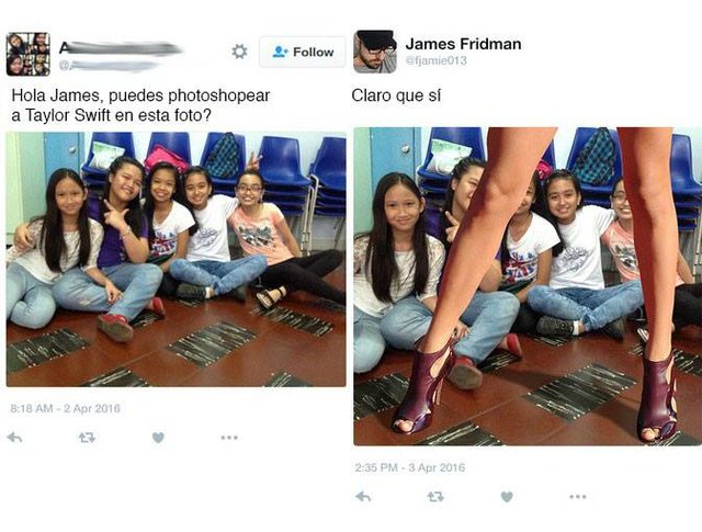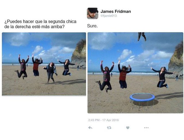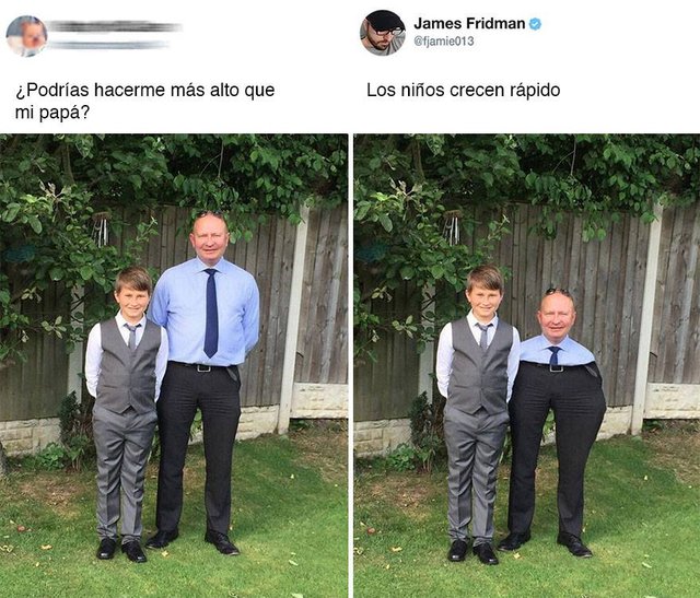 James Fridman, conocido por ser un experto del famoso programa de Adobe, recibe miles de peticiones a través de las redes sociales de personas que le piden modificar imágenes en donde ‘salieron mal’, aunque siempre las devuelve como él mismo lo interpreta, es decir, con un giro retorcido.
