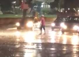 Mientras la mayoría de los sanjuaninos buscaba resguardo ante la intensa lluvia que sorprendió anoche cerca de las 22, un malabarista sorprendió a todos.