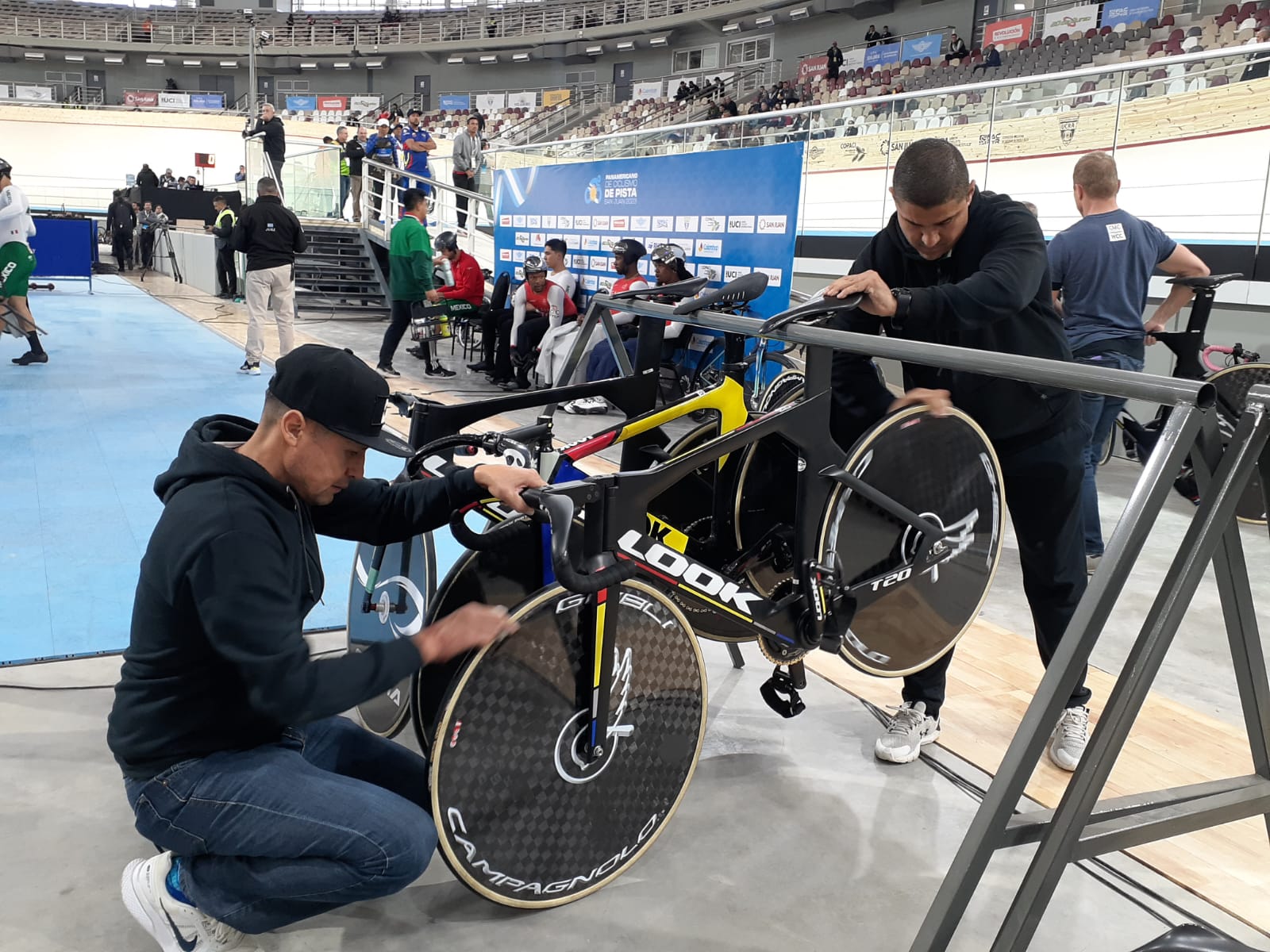 Mientras los ciclistas salen de sus boxes y realizan los movimientos previos antes de salir a competir, las bicis son propiedad de los mecánicos, auxilios y comisarios. Los primeros se encargan de afinar los detalles de manera que los cambios y las multiplicaciones estén dadas para correr, después los auxilios con paño y cepillo en mano, le sacan el mínimo polvillo que las bicis puedan tener para que, a la hora de salir a la pista, salvan relucientes.