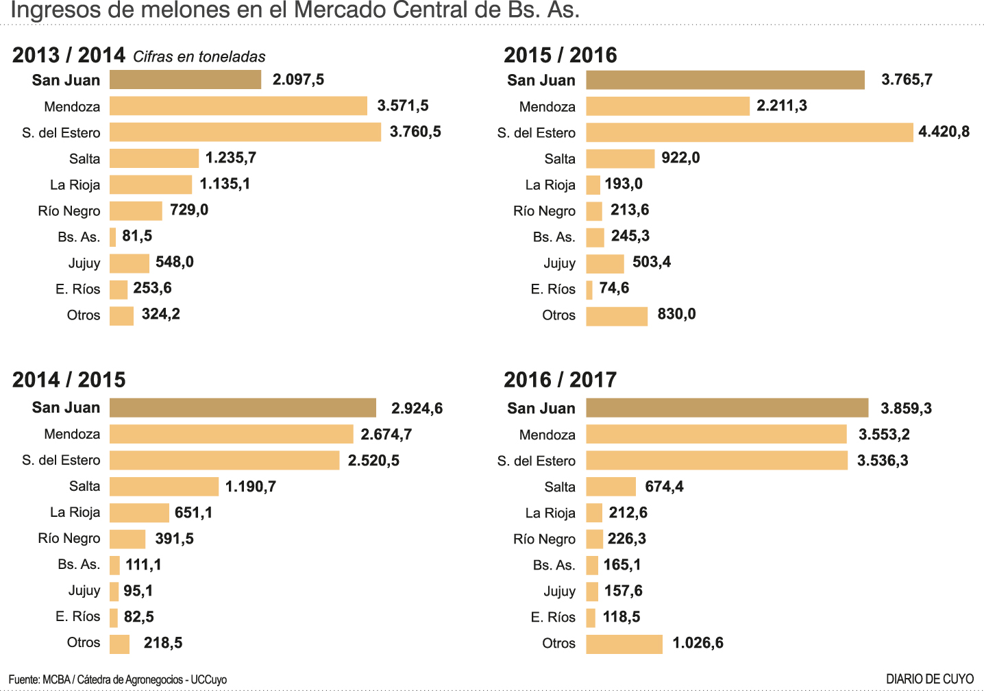 Así San Juan tiende a consolidar su papel como proveedor del Melón mediante el impacto comercial de su IG "Melón de Media Agua San Juan". En la campaña 13-14 nuestra provincia comercializaba el 15,3 % del total del Mercado Central de Buenos Aires que rondó en esa campaña las 13.700 toneladas de esta cucurbitácea. En la última campaña, 15-16, el porcentaje para San Juan del mercado total fue del 28,5% de unas 13.500 toneladas.